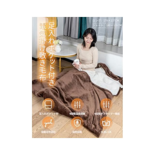【2024新発売足先が冷えない電気毛布&180×131cm掛敷兼用】2024の新しい電気毛布は、足先まで暖まるフットポケット付きで、暖かく快適な眠りを求める方に最適です! 180×131cmの大サイズなので、家族や友人と一緒に使うこともできますし、2人で使うこともできます。床に座り、本体をひざや腰にかけたり、ソファーに敷いてし使用たりするなどいろんな場合でも使用できます!1枚の電気カーペットで寒い冬の日には暖かさを提供します。