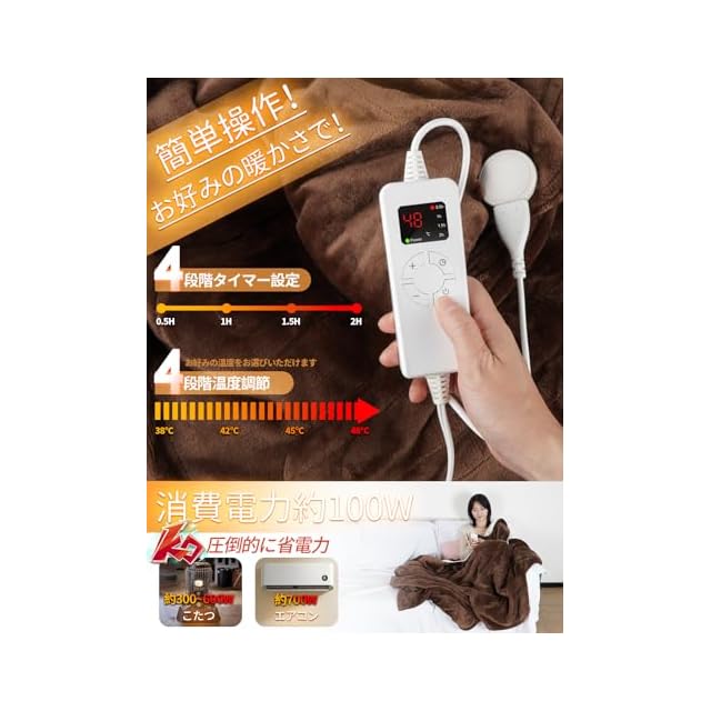 【4段階温度調整・4段階タイマー消し忘れ防止・省エネ】この電気毛布は4段階の温度調節機能を備えており、さまざまな暖かさのニーズに応えます。微温から高温まで、快適な温度を自由に調整可能です。タイマーボタンを押すだけで、0.5時間、1時間、1.5時間、2時間の4段階タイマーを設定することができます。無駄な電力消費を抑えるだけでなく、切り忘れを防ぐことができ、子どもや高齢者も安心して利用できる。最大消費電力は100 Wで、他の暖房機器よりも電気代を抑えることができます。安全性と暖かさが完璧に融合し、電気代の削減にも大きく貢献します。毎時の電気代は約3.12円です。