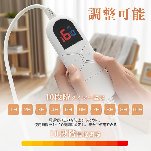【10段階あり、温度範囲:30~45℃】電気ブランケットは約30℃~約45℃の間で細かく10段階の温度設定ができます。自由に調節でき、好みの温度を使うことができる。シンプルな簡単操作で、コントローラー上のディスプレイに1~10までの温度設定が表示されます。さらには省エネ設計で、他の暖房器具よりも経済的です。電気代や使用時間を気にせずお使い頂けます。