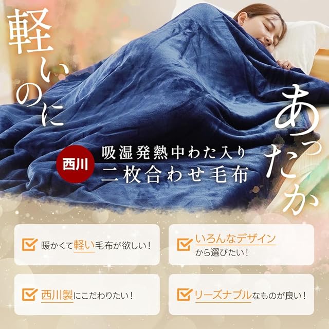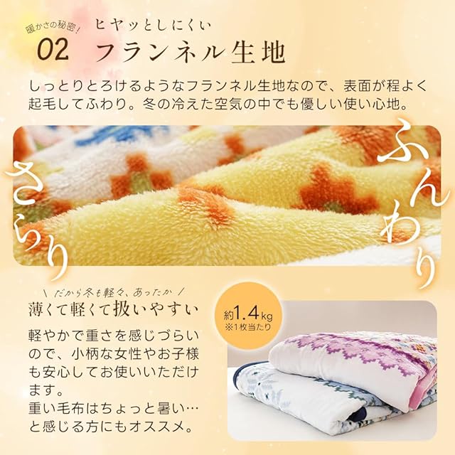 表地・裏地ともに優しくなめらかなフランネルタッチ♪毛布生地を2枚合わせて縫製する「2枚合わせ毛布」なので、2枚の生地の間に空気の層ができ、保温力UP♪衿付きで外から冷たい空気が入るのを防ぎ、体温で温まった空気を逃がしません。吸湿発熱効果のある繊維を中わたに使用。体温から生まれる熱や汗・皮膚呼吸による湿気によってほんのり心地よいあたたかさを感じられます。薄手寄りのフランネル生地を使用することで、軽くて扱いやすいのに、吸湿発熱わたであったかい毛布に仕上がりました。もちろんご家庭で丸洗いもOK!
