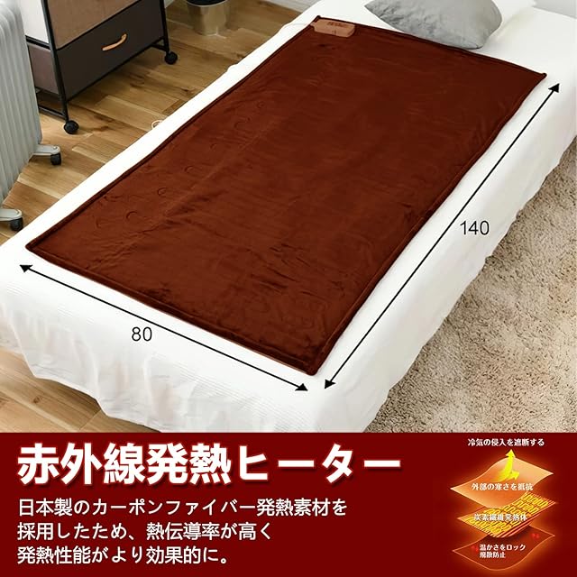 【優れた防寒性】 145x80cmサイズ肩から足にかけ、全身を効率良く暖めるのにちょうどいいサイズ。電気毛布に内部のヒーター部分は炭素繊維加熱線を採用、電源オンにすると、毛布全体がじんわり暖まり、床からの冷気を電気毛布が遮り、布団の中に通しません。布団に入った瞬間、温かさが身体を包み込み!寒い季節でも温もりを感じできます!