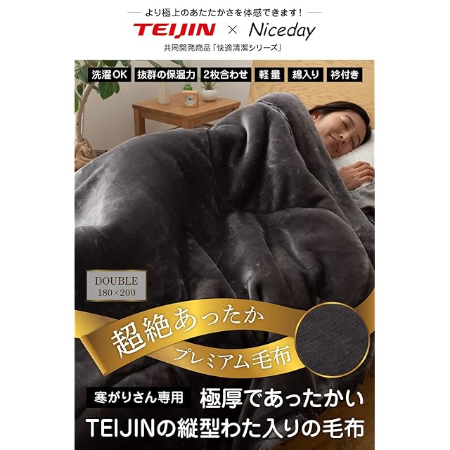 【あったかさイチオシ!寒さ厳しい冬もこれ一枚でOK】「テイジン×Niceday共同開発」人気の快適清潔シリーズにボリュームたっぷりの極厚あったか毛布が2021年新登場!毛布の中材にテイジンの縦成型わたを使用、あったかい空気をたっぷりため込んで逃がさない独自の縦成型デッドエア構造で超絶あったか!やわらかくて肌沿いがよく、蓄熱・保温性にも優れているので寒い冬もこれ1枚でOK。