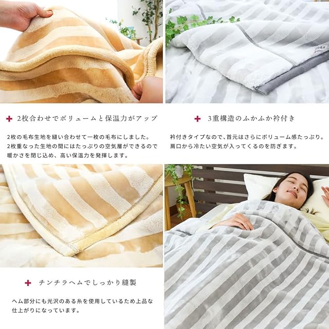 【サイズ】約140×200cm 【組成】ポリエステル100% 【仕様】2枚合わせタイプ 衿付き チンチラヘム 【製品重量】約3.2kg 【生産国】中国製