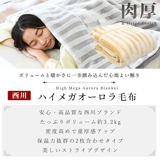 【メガオーロラ毛布がさらに進化!3.2kgの超ボリューム毛布!】メガオーロラ毛布より、さらにボリュームや上質タッチを求める方に!密度高めで重厚感アップ!美しいストライプのデザインでお部屋もエレガントな雰囲気に!
