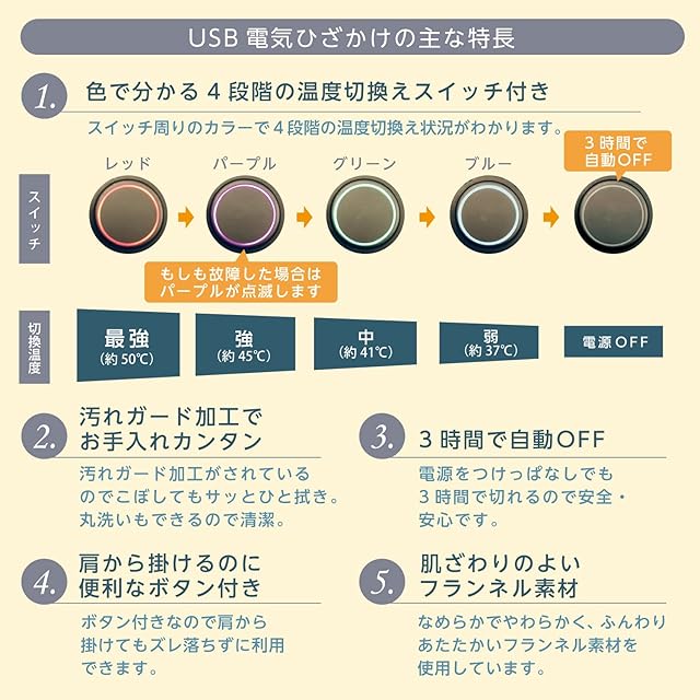 【簡単操作】スイッチボタンを押すと「オン・最強⇒強⇒中⇒弱⇒オフ」と細かく4段階の温度切換やオン・オフすることができます。 また、電源を入れたまま3時間が経つと自動で電源がオフになる「3h自動OFFタイマー」付きで、切り忘れても安心です。