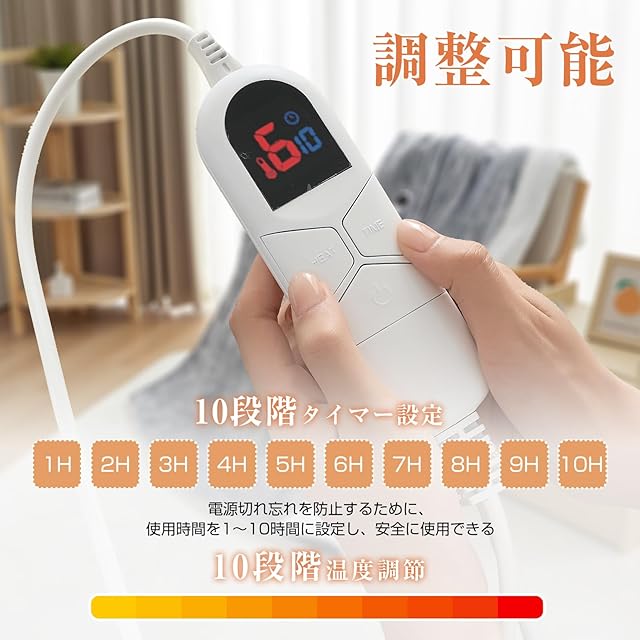 【10段階あり、温度範囲:30~45℃】電気ブランケットは約30℃~約45℃の間で細かく10段階の温度設定ができます。自由に調節でき、好みの温度を使うことができる。シンプルな簡単操作で、コントローラー上のディスプレイに1~10までの温度設定が表示されます。さらには省エネ設計で、他の暖房器具よりも経済的です。電気代や使用時間を気にせずお使い頂けます。