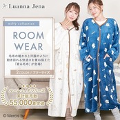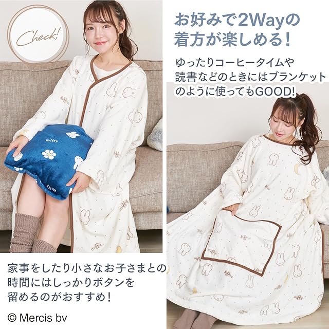 【商品仕様】〇サイズ:フリーサイズ(着丈--115cm、バスト--63.5cm、肩幅--66cm、袖丈--38cm、袖口--32cm) 〇カラー:ネイビー(花柄)、オフホワイト(月柄) 〇素材:ポリエステル100% 〇商品内容:ミッフィー着る毛布 〇ブランド:Luanna Jena(ルアンナジェナ)