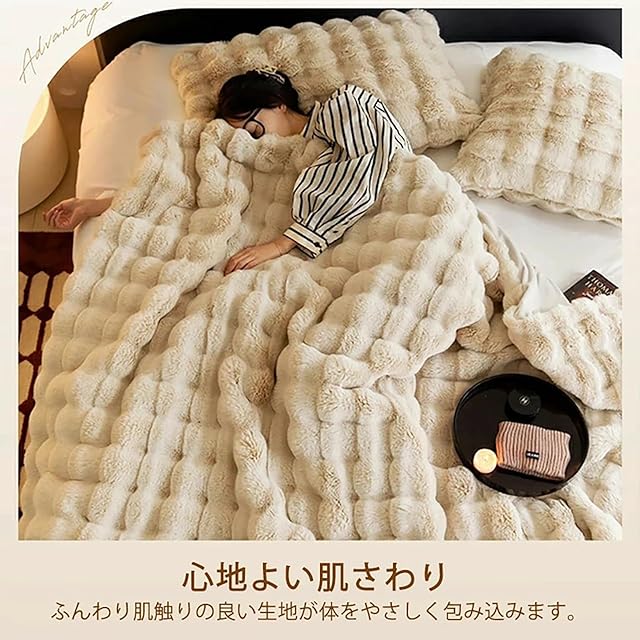 【二枚合わせ毛布】表側はなめらかなラビットファー調生地で、裏側は少し厚手のもこもこ柔らかいミンクファー調生地で仕上げた二枚合わせ毛布です。ふわふわやわらかくて、ふんわりとした肌触りで、心も体も温めてくれます。