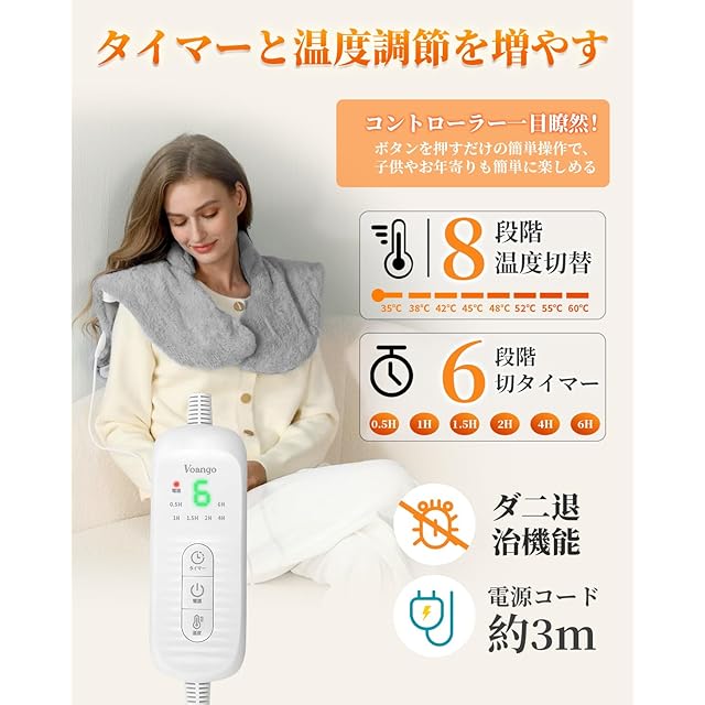 ✨【8段階温度調節&6つタイマー機能、あらゆる瞬間に寄り添い】 寒い冬の間、8段階の温度調節と6つタイマー機能を持つ電熱肩当ては、思いやりのあるパートナーのように、君が暖かさがほしい際に、いつも最適な暖かさを与えてくれる。35℃から60℃まで、30分から6時間まで、温度の高さ、時間の長さはすべて自分の手に握られている。実際状況や自分好みの暖かさによって、温度と時間を細かく調節することで、自分だけの暖かさを満喫ことができる。さらに素晴らしいことに、デジタルLEDコントローラを採用した設計で、一目瞭然で操作が簡単で、子供やお年寄りも簡単に楽しめる。8段階の温度調節と6つタイマー機能を搭載する電気パッドは、寒い冬を家族とともに過ごすのに最適なパートナーである!