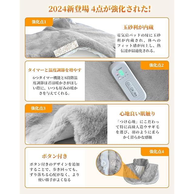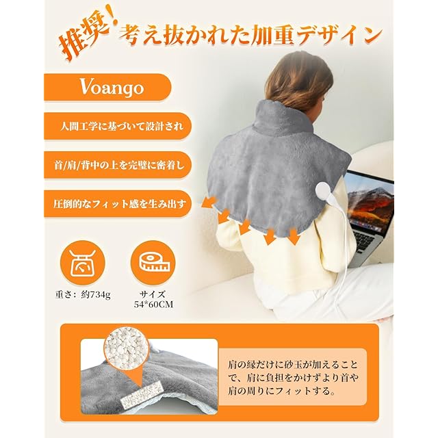 Voango 電気肩パッド 電気肩マット 【表面兎毛調+裏面フランネル素材】 4way使用 首/肩/背中/腰/ひざ/腹 8段階温度切替 6段階切タイマー 電気肩掛け ふわふわ 高級フランネル生地 肩 首 あたため 加熱 肩当て 電気毛布 省エネ 暖房器具 洗える 電気パッド 過熱保護 抗菌防臭 ダニ退治 防寒対策 自宅 オフィス用 54*60cm (グレー)