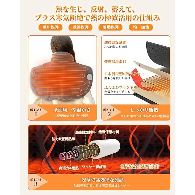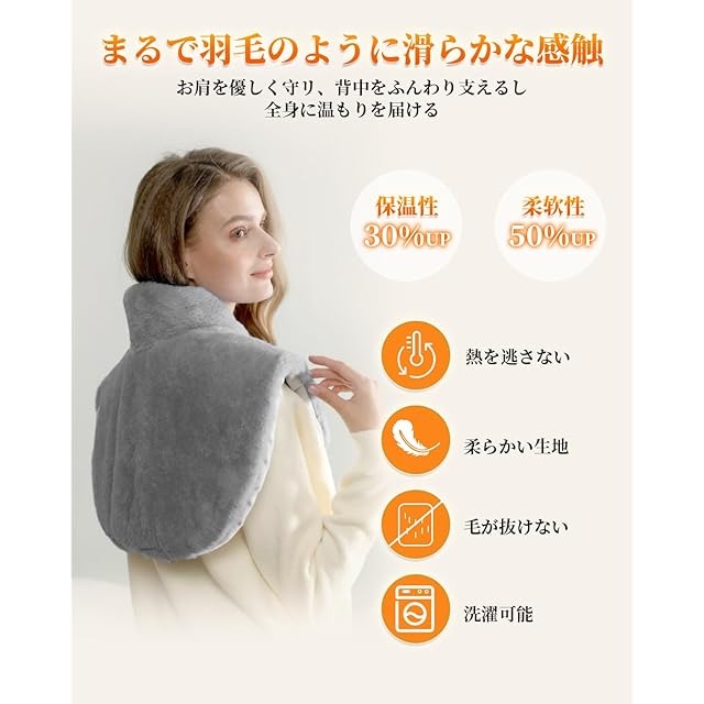 【やわらかい感触に包まれて、究極のくつろぎを楽しむ】 電気肩掛けは従来のシープ毛ボアを捨てて、トップのダプルクリスタルベルベット生地を採用した。密度の高い超極細な繊維が触れるたびにまるで絹のような滑らかで柔らかさを満喫する。掛けて敷くことができて、いつまで雲のように軽やかで柔らかくて、身にかけて、肩、首、背中の疲れを和らげると同時に、じんわりとした温もりが体になじみ心までほぐれる。※人間工学に基づいて設計され、首/肩/背中の上を完璧に密着し、圧倒的なフィット感を生み出している。※ 超極細フリース繊維は保温性、通気性に優れ、摩擦にも強い。何度洗濯しても毛玉や糸くずが出てにくく、長持ちして利用できる。