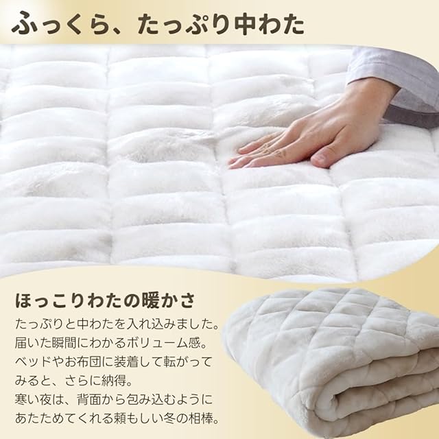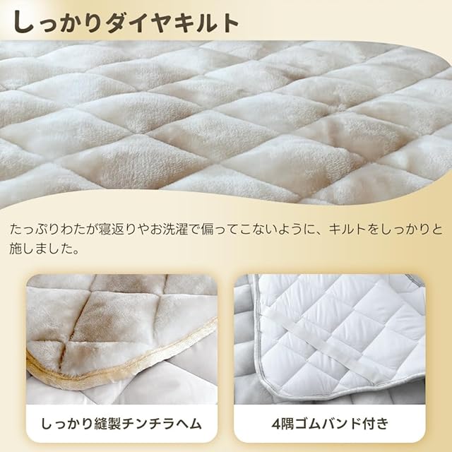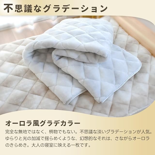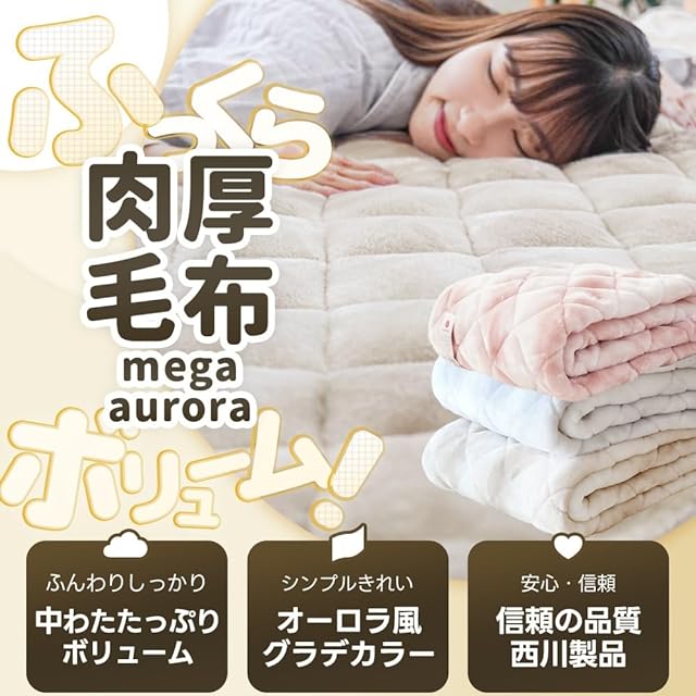 【ふっくらボリュームで暖か♪西川「メガオーロラ」シリーズの毛布敷きパッド】ふんわりボアの暖かタッチ、さらにたっぷりとわたを入れ込みました。届いた瞬間に分かるボリューム感、ベッドやお布団に装着して転がってみるとさらに納得。寒い夜は背面から包み込むようにあたためてくれる頼もしい冬の相棒です。わたが寝返りやお洗濯で偏ってこないように、しっかりダイヤキルトを施しました。ヘムは高級感のあるチンチラヘムタイプ。完全な無地ではなくて、柄物でもない不思議な淡いグラデーションが人気です。裏面四隅にゴムバンド付きで敷き布団・ベッドマットレスのどちらでも着脱ラクラク♪洗濯ネット使用にて丸洗いもOK!