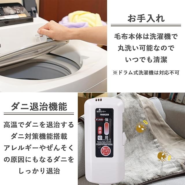 【お手入れ】毛布本体は洗濯機で丸洗い可能なので、いつでも清潔に気持ちよくお使いいただけます。コントローラーを取り外して洗濯してください。※ドラム式洗濯機は対応不可