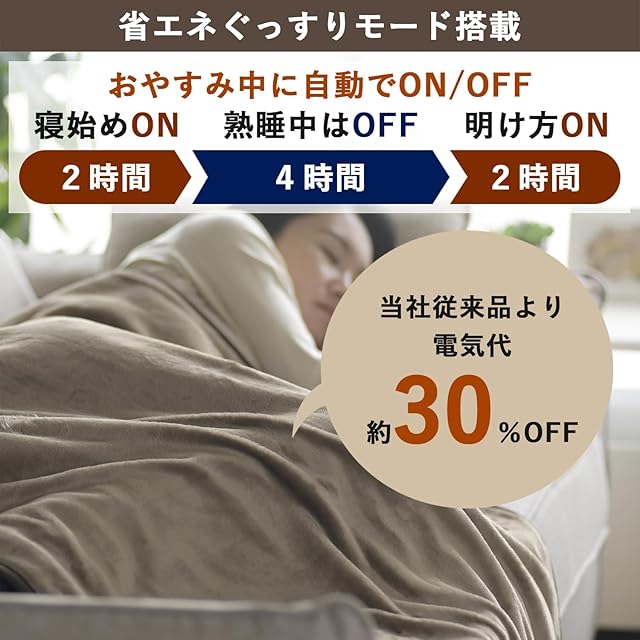 【省エネぐっすりモード】押すだけで快眠と省エネを実現、弊社従来品より電気代が約30%OFFになる「省エネぐっすりモード」を搭載。タイマースイッチを押すと2時間暖房、その後4時間暖房を停止、さらにその後2時間暖房します。就寝中は温めすぎを防止し、起床前に体を温めることにより快適な睡眠・起床を得られます。また、安全機能として電源入後12時間で自動で電源OFFになる12時間切タイマーを搭載しております。