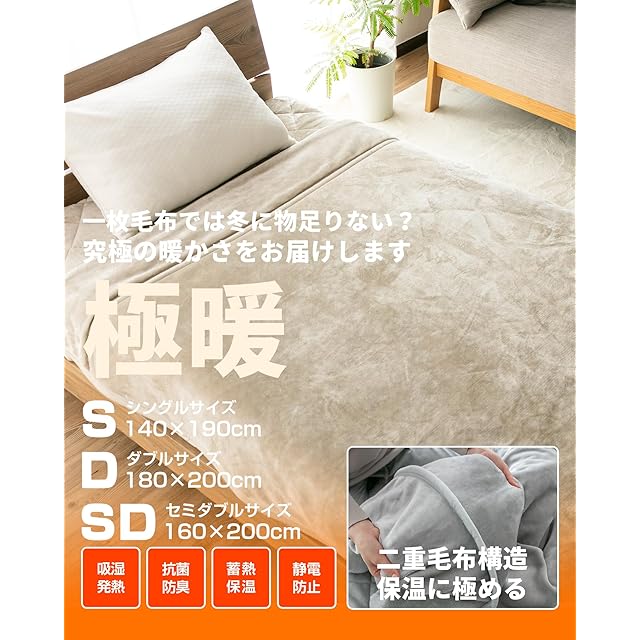 毛布 冬用 厚手 ダブル ベージュ 二枚合わせ ブランケット 三層構造 吸湿発熱 保湿 静電防止 マイクロファイバー 柔らかく肌触り フランネル 洗える もうふ 180x200cm