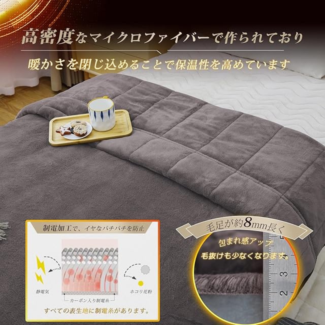 【真冬に絶対】電気代が上昇する今、暖かさ抜群の毛布は冬の快適な必需品です。弊社のこの毛布布団は、アルミシートとエアロゲルシートを使い二重の断熱性に加え、蓄熱綿と吸湿発熱綿を組み合わせた二重の保温性を持っています。また、中綿には日本の有名な帝人の抗菌防臭繊維が含まれ、さらに表面生地には光触媒加工を施したフランネルを使用しており、温感フランネルを使用し、乾燥肌を防ぎながら、肌の修復をサポートし、静電気も抑えるよう工夫しています。