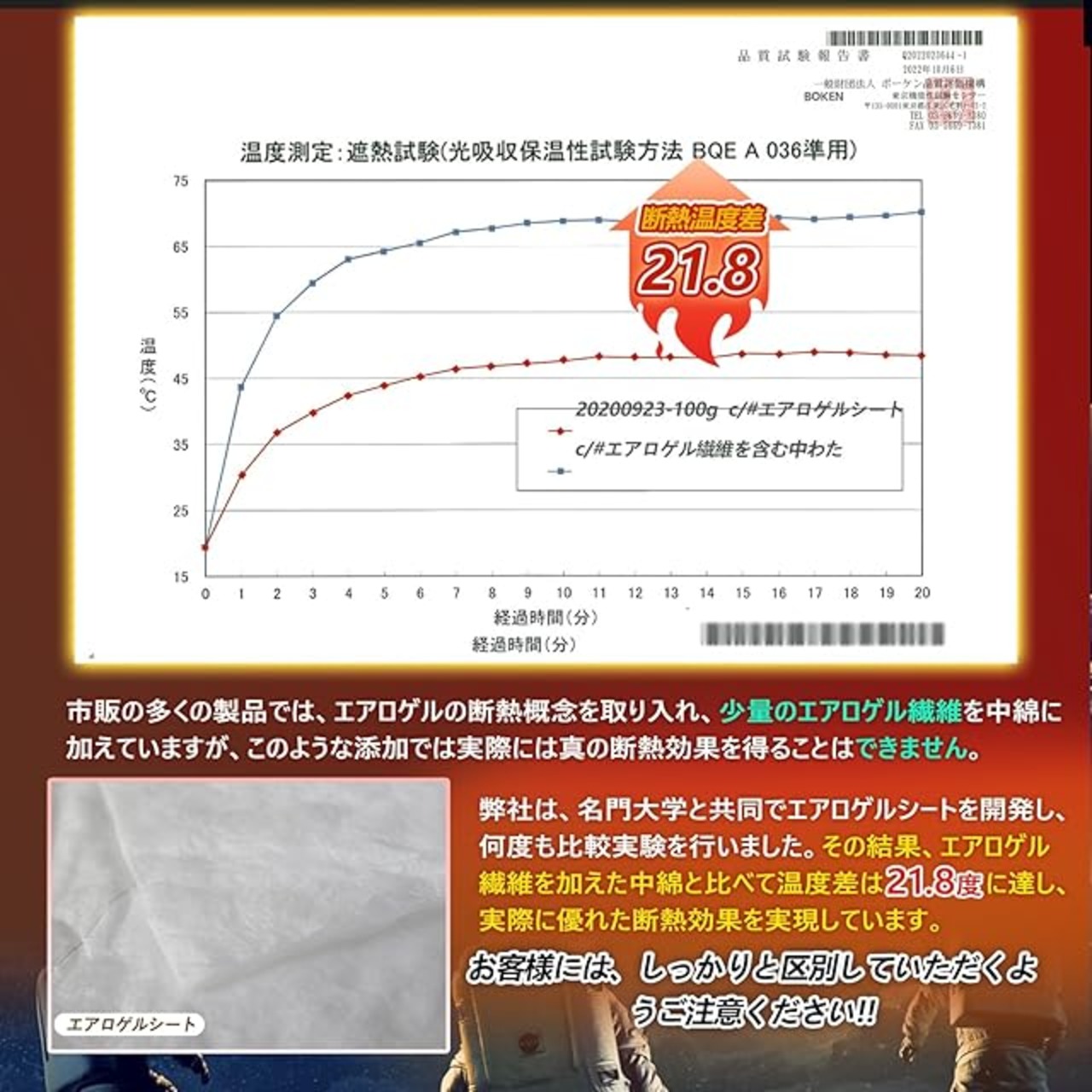 【宇宙服・エアロゲルシート】この毛布が使用している「エアロゲルシート」は、NASAが宇宙空間でも断熱材として採用され、広く知られたシリカエアロゲルをさらに改良し、当社の研究所と有名な大学が研究して、独自加工した特殊生地です、断熱性に優れ、外部からの冷気を遮り、内部の熱を逃がしにくいのは魅力です。