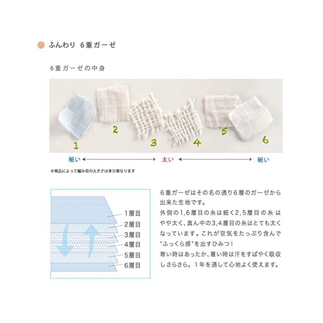 織目の密度が異なるガーゼを6層に重ねることで、ふんわり空気を含みます