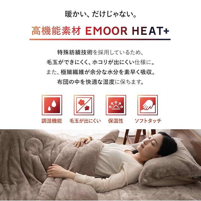 「エムールヒートプラス」は、人から出る蒸気や汗を吸収し、熱に変える働きをします。人は一夜でコップ2杯分の寝汗をかくため、発熱のエネルギー源が消えることなく、布団の中の暖かさが持続します。