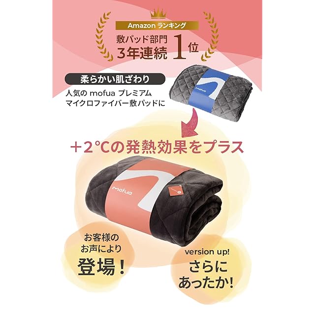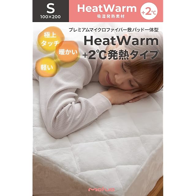 【プラス2℃の発熱素材Heatwramでさらにあったか】なめらかな肌ざわりと、ホッとする心地よさを届ける「mofua(モフア)」です。標準モデルのプレミアムマイクロファイバー敷きパッドに発熱機能を追加。さらに暖かく過ごせる発熱+2℃タイプ。 汗や湿気などの水分を熱に変える発熱素材を採用し、シルクより細い超極細繊維を高密度に編み上げています。寒い季節もあったかく快適に過ごせる敷きパッド一体型ボックスシーツです。
