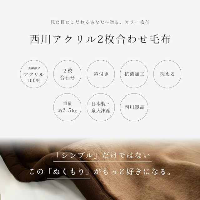 ≪“眠りの恋人”「カラー毛布」≫ふんわりやさしい毛布に包まれて。厳しい冬の寒さの中に、ほっと安らぐ憩いの時間をお届けします。西川の日本製という確かな品質で、優しいプレーンの毛布を作りました。細くしなやかに加工できるアクリルをふんだんに100%使用。短めですが、みっちりと密集したこのアクリル100%の毛羽部分が肌にやさしく触れ、しかも保温性が高く暖か♪