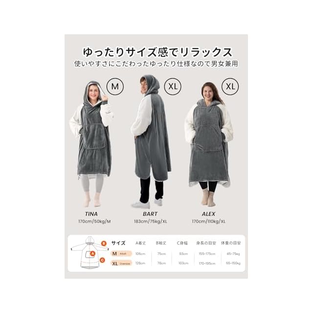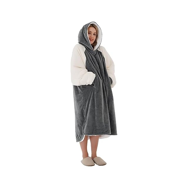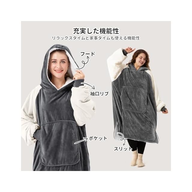 [Winthome] 極厚版 着る毛布 メンズ 大きいサイズ ゲーミング 部屋着 ルームウェア 二層しっかり生地 ボア付き フード ポケット付き かいまき ガウン 厚手 レディース 冬冷え対策 防寒 保温 M XLサイズ(グレー/ホワイト, M)