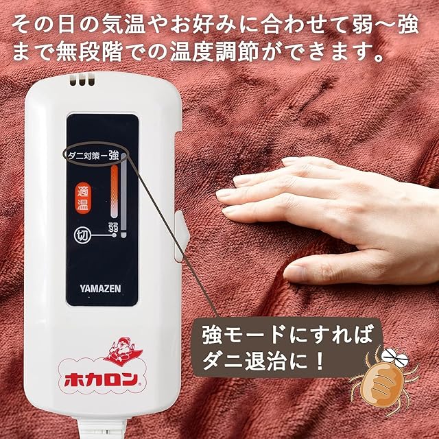 【温度調節】お好みに合わせて弱から強まで無段階で調節できます。その日の気温や体調に合わせて、お好みで調節してください。また、高温でダニを退治するダニ対策機能付きでアレルギーやぜんそくの原因にもなるダニをしっかり退治します。