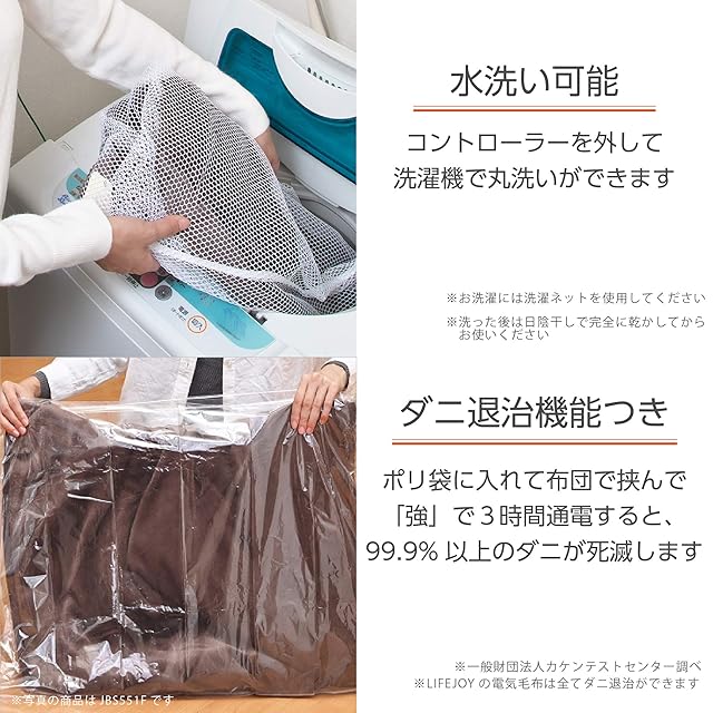 【ダニ退治ができて、洗える】屋内じん性ダニ類に対応したダニ退治機能がついています。 電気毛布をポリ袋に入れて、布団に挟み、3時間「強」で運転するだけです。 これだけで99.9%のダニを退治できます。 しかもコントローラーを取り外せば、洗濯機で丸洗いできるので、いつでも清潔にお使いいただけます。