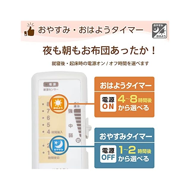 【おやすみ・おはようタイマー搭載】就寝時に電源オフを1時間と2時間で選べるおやすみタイマー、電源オンをを4~8時間後で選べるおはようタイマーが搭載されております。就寝時はあたため過ぎず快適に睡眠、起床時はあたたかく気持ちの良い目覚めができます。