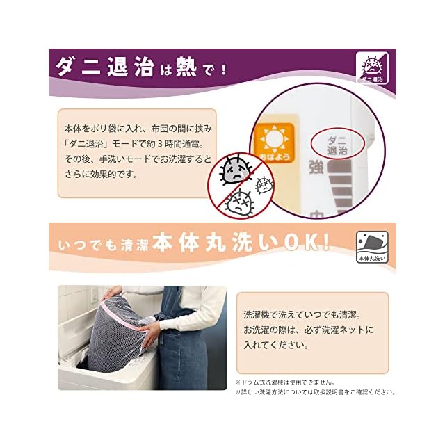 【本体丸洗いOK】本製品は、コントローラーを外すことで洗濯機で丸洗いが可能です。ダニ退治機能も搭載されておりますので、ダニ退治後に丸洗いすることで清潔にご使用になれます。※洗濯の際は、洗濯ネットをご使用ください。※ドラム型洗濯機や乾燥機は使用不可。