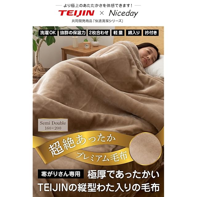 【あったかさイチオシ!寒さ厳しい冬もこれ一枚でOK】「テイジン×Niceday共同開発」人気の快適清潔シリーズにボリュームたっぷりの極厚あったか毛布が2021年新登場!毛布の中材にテイジンの縦成型わたを使用、あったかい空気をたっぷりため込んで逃がさない独自の縦成型デッドエア構造で超絶あったか!やわらかくて肌沿いがよく、蓄熱・保温性にも優れているので寒い冬もこれ1枚でOK。