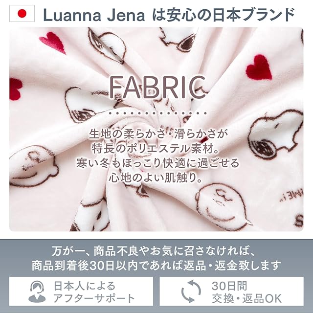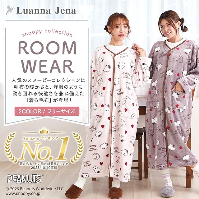 【商品仕様】〇サイズ:フリーサイズ(着丈--115cm、バスト--63.5cm、肩幅--66cm、袖丈--38cm、袖口--32cm) 〇カラー:さくら色、ローズグレー 〇素材:ポリエステル100% 〇商品内容:スヌーピー着る毛布 〇ブランド:Luanna Jena(ルアンナジェナ)
