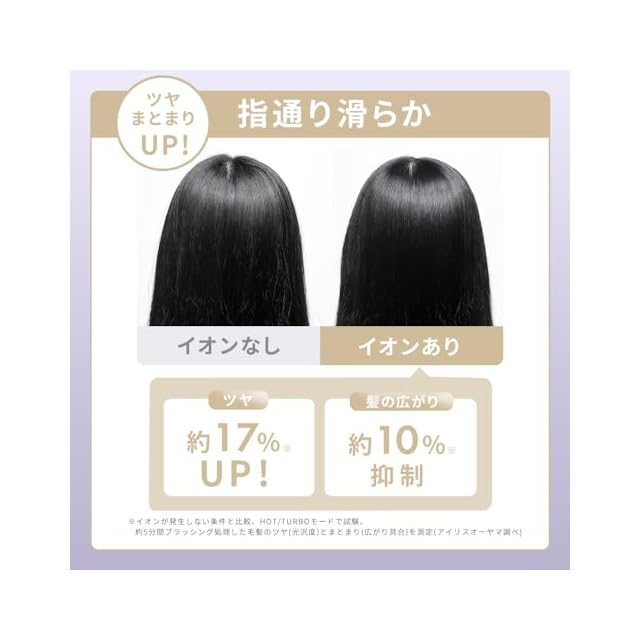 【アイリスオーヤマ史上最速乾燥/最大風速40.5m/s】本製品はアイリスオーヤマ史上最大風速40.5m/sの風量でアイリスオーヤマ従来品のHDR-M301 と比較して乾燥時間は約25%短縮できます。高速で素早く乾かすだけでなく、幅約5cmのスリム設計。使用後はハンドルを折りたたんでコンパクトに収納できます。また重さは約380gで350mlのペットボトルほどの軽さ。DCブラシレスモーターを採用しているため、ブラシ付きDCモーターと比べて、寿命が長く、静音性に優れ、小型で高出力、低振動です。そのため軽量でコンパクトかつパワフルな高風速を実現。※アイリスオーヤマのドライヤーにおいて。2024年7月現在。※最大風速量はTURBO時でのアイリスオーヤマの調べ。※HOT/TURBOモードで試験。タオルドライ後の毛束を乾燥させたときの重量変化より算出(アイリスオーヤマの調べ)。※使用環境(季節・温度など)や個人差により効果は異なります。