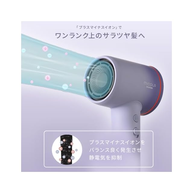 【プラスマイナスイオンドライヤー】プラスイオンとマイナスイオンを程よいバランスで補給する「プラスマイナスイオン」機能で静電気を抑制し、ツヤまとまりがUPします。また、キューティクルを引き締め、カラー退色を抑制します。