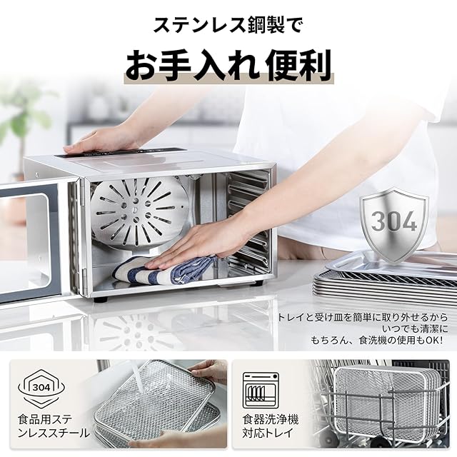 ❀【安全と清掃便利】この食品乾燥機は食品グレードSS304ステンレスに製作されますから、耐熱し、錆止めし、お手入れが簡単です。ステンレスだから、加熱しても劣化しないし、有害物質も出さないです。耐久性や使いやすさにこだわり、トレイも匂い移りしにくいステンレス鋼を採用し、食器洗浄機にも対応できます。一年付き、もし何か不具合がありましたらぜひ弊社までご連絡してください。