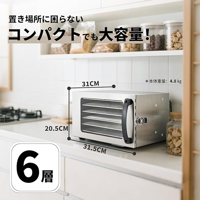 ❀【手軽でコンパクト】食品乾燥機のトレイが6階しかないので、コンパクトで使う場所を選ばません。一人暮らしなら一回で一週間の分を作れるが、家族と一緒に住んでいる方も一回で家族の分を作れます。天日干しのように天候に左右されないから、食べたいときにいつも食べたい分だけ新鮮な食材で作れます。