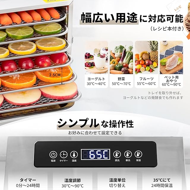 ❀【簡単操作】ワンタッチで30℃から90℃まで5度ずつ調整でき、幅広い温度帯は様々なフードの乾燥ニーズに適応することもできます。24時間タイマー機能があるので、いつも注意を払う必要もない、より気楽です。なお、乾燥完了しました後、自動的に35℃で24時間保温し、夜間の乾燥終了後も安心です。