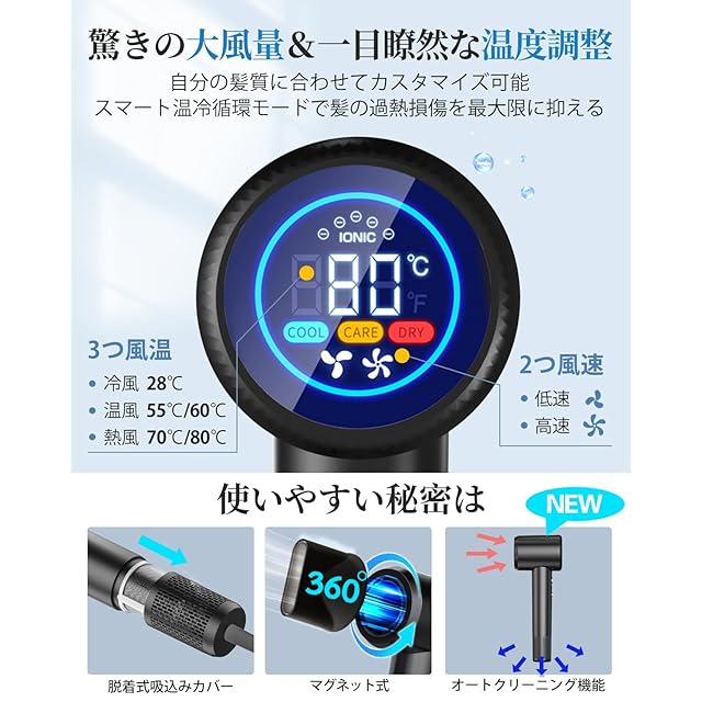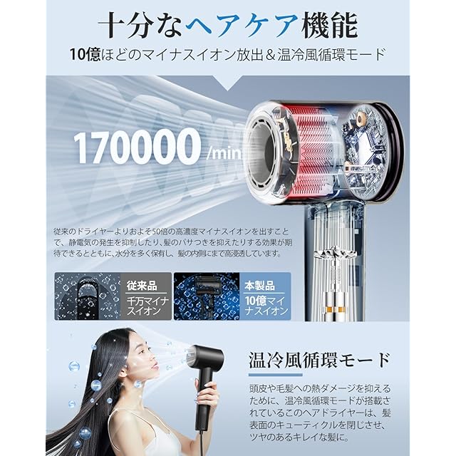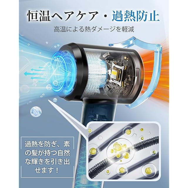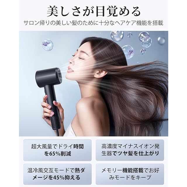 【髪質改善に貢献する先進イオン技術】:10億級マイナスイオンを発生させる独自システムにより、乾燥中の静電気やまとまりにくさを解消。この軽量ドライヤーで発生した高濃度イオンが髪のキューティクル層に深く浸透し、水分を保持しながらツヤのある健康的な髪質へ導きます。高温によるパサつきや枝毛の原因を抑制する「温冷風自動切替」機能が、熱ダメージから髪を保護。3段階の温度調節と2段階の風量調整で、デリケートな頭皮や敏感肌の方も安心してお使いいただけます。美容師推奨のイオンテクノロジーが、毎日のヘアケアをプロ級ケアに昇華させます。