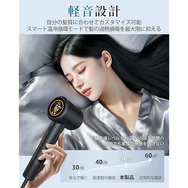 【静音設計で快適な使用体験を実現】:新型静音モーターを搭載し、従来比で動作音を約30%低減。早朝や夜間の使用でも家族へ気兼ねなく、リラックスした環境で乾燥可能です。軽量ボディ(従来機比20%軽量化)とコンパクト設計で、手の疲れを軽減しながら長時間の使用も快適。本体重量を分散するエルゴノミック形状が、ストランドごとの丁寧な乾燥をサポートします。寝室から旅行先まで、あらゆるシーンで邪魔にならない静穏性は、当ヘアドライヤーの最大メリットの一つです。