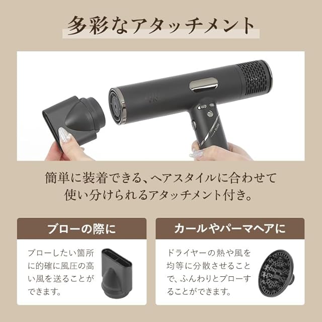 【スタイリング自在の2WAY】用途に合わせて使い分けられる2種類のアタッチメント付属。ピンポイントで風を当てられるノズルと、カール用のディフューザーで様々なスタイリングに対応。