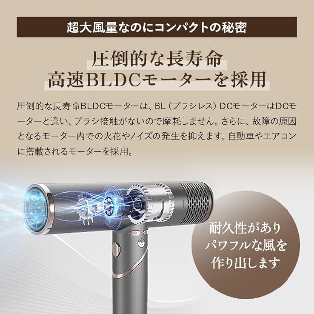 【高性能BLDCモーター搭載】自動車やエアコンにも使われる高性能BLDCモーター搭載。圧倒的な長寿命と安定した性能で、プロ仕様の使用にも耐える高い信頼性を実現。