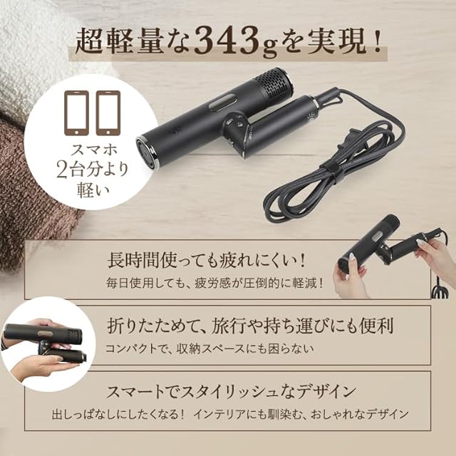 【軽量&コンパクト設計】わずか343gの超軽量ボディに、折りたたみ機能を搭載。長時間の使用でも疲れにくく、旅行や出張にも便利なコンパクト設計。