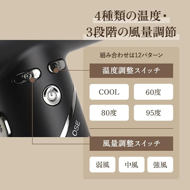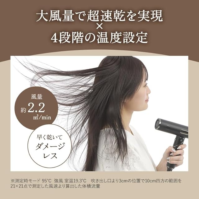 【大風量で超速乾を実現】大風量で素早く乾かせる上、4段階の温度設定と3段階の風量調節で髪質に合わせたカスタマイズが可能。ダメージを抑えながら、理想のスタイリングを実現。