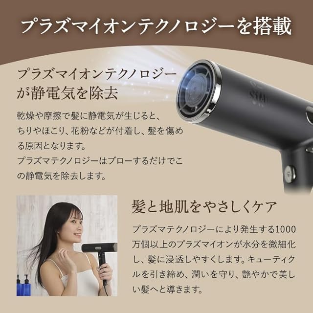 【プラズマイオンケア】プラズマイオンテクノロジーで髪の静電気を除去。1000万個以上のイオンが水分を微細化し、キューティクルを整えて潤いのある美しい髪へ。