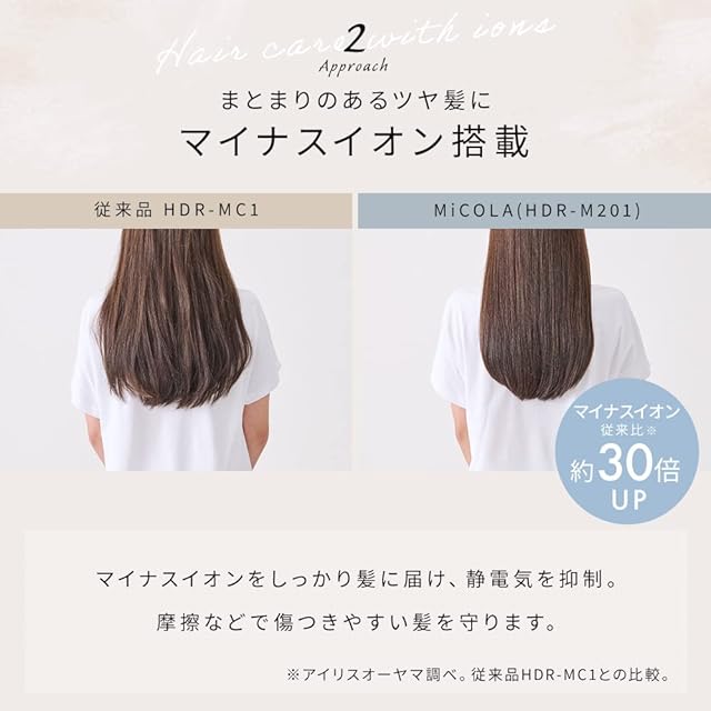 【MiCOLA】毎日のケアをもっと私らしく、もっとポジティブに。そんな思いから生まれた「MiCOLA」は/まだ初々しい髪や肌をいたわりながらあなただけの個性を引き出すお手伝いするブランドです。自分らしさの初めての一歩を踏み出したあなたに、カラフルなエールを送ります。【カラーバリエーション】本製品はダークグレー/オフホワイト/モカ/ブルー/の4つのカラー展開です。カラーだけでなく、マットな質感でインテリアに馴染むおしゃれなドライヤーです。【商品詳細】■風量:2.0m³/分(TURBO時・ノズルなし・アイリスオーヤマ調べ)■質量:約515g ■電源コードの長さ:約1.8m ■温風:約50℃(TURRBO・ノズルあり・室温30°のとき) ■定格電源:AC100V、50/60Hz/■定格消費電力:1200w(TURBO) ■付属品:取扱説明書、ノズル ■マイナスイオン ■遠赤外線放射