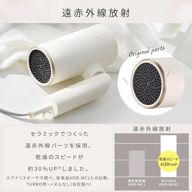 【速乾遠赤外線搭載】速乾遠赤外線セラミックパーツ採用により、乾燥スピードが約30%UP。(※当社従来品HDR-MC1と比較[当社調べ])一般的なドライヤーは、ヒーターにより温めた風を直接髪にあてることで乾燥させますが、本製品はさらに遠赤外線パーツによって空気を介さず熱を伝えることでより広く髪全体を温めます。約50℃の低めの温風でも髪を早く乾かすことができ、熱によるダメージの軽減が期待できます。