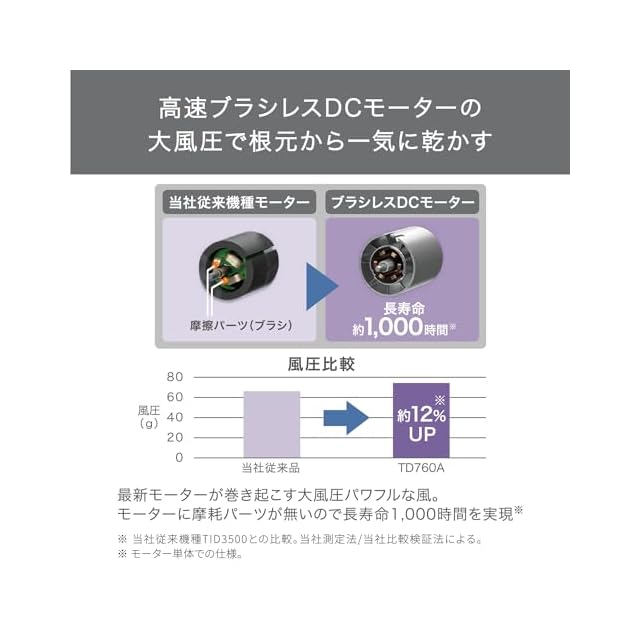 大風圧の高速ブラシレスDCモーター搭載。最新モーターが巻き起こす体感4.1m3/分(自社測定)のパワフルな風が髪をかき分け、根元から一気に乾かします。
