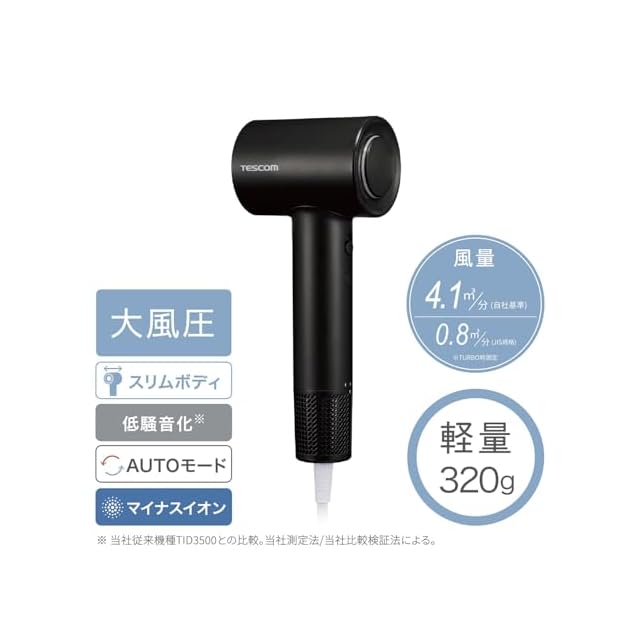 テスコム ドライヤー I字型 マイナスイオン 軽量 コンパクト 冷温風 静音 ラク抜きプラグ ブラック TD760A-K
