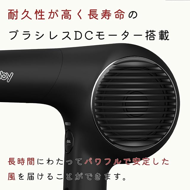 本体寸法は約226×245×77mm、本体質量は約720gと軽量設計となっているため、長時間の使用でも手首への負担を軽減しやすくなっています。コードの長さは3.0mと十分な余裕があり、セットフードやスタンドなどの付属品も充実。風量切り替えはBOOST/TURBO/SET/OFFの4段階で行え、切り替え時には温風と冷風を簡単に使い分けできる即冷スイッチを搭載しています。さらにマイナスイオン機能によって、髪の表面を整えながらスピーディに仕上げられる点も魅力です。