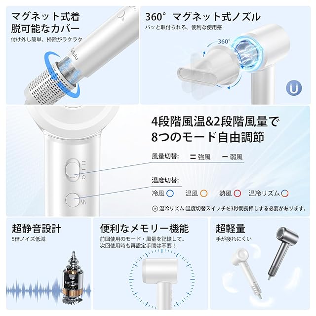 【8億超高浸透マイナスイオン・髪質改善】あなたの髪を一日中サラサラで美しく保つ秘密が、このヘアドライヤーには内蔵されています!①特許取得済みの【8億個の超高浸透・高濃度マイナスイオン】発生装置 →水分がキューティクルのわずかな間へ浸透。さらに静電気を抑制し、髪の乾燥と切れ毛を防ぎます。髪のツヤとまとまりを実感できます!②【AIマート温度制御・恒温ヘアケア】→安定な送風温度を制御し、頭皮と髪にダブルケア、髪の光沢を保つ③過熱防止システム→過熱を防ぎ、髪への熱ダメージを防ぐ!④温冷リズムモード→髪表面が熱くなりすぎる前に冷ますことができ、髪のうねりや広がりを抑えてまとまりのある髪と、ツヤ感がさらにアップ!あなたの髪は、常に潤いと輝きにあふれ、まるでプロの美容師が手入れしたような仕上がりになります。速乾x美髪を両立したヘアドライヤーです。